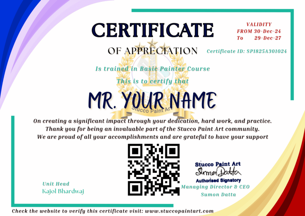 Receive an official Stucco Paint Art Training Certificate after successful course completion — proof of your professional skill.